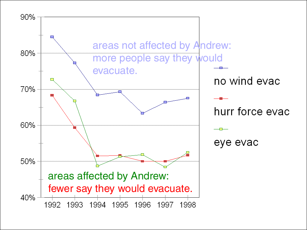This chart shows the percentage of people who each year said they would evacuate (would not stay home) in response to the question "In the future, if you had two days notice to prepare for a hurricane of the intensity of Hurricanes Floyd or Andrew, which of the following would you be most likely to do? Would you leave the area completely in order to get out of the path of the storm, would you go to a shelter, would you go to stay with family or friends in the area, or would you stay in your home during the storm? "